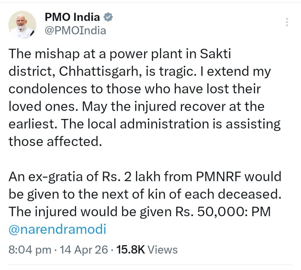 नई दिल्ली/सक्ती: छत्तीसगढ़ के सक्ती जिले में हुए पावर प्लांट हादसे पर प्रधानमंत्री नरेंद्र मोदी ने गहरा दुख व्यक्त किया है। पीएमओ की ओर से किए गए ट्वीट में हादसे को अत्यंत दुखद बताते हुए मृतकों के परिजनों के प्रति संवेदना प्रकट की गई है।